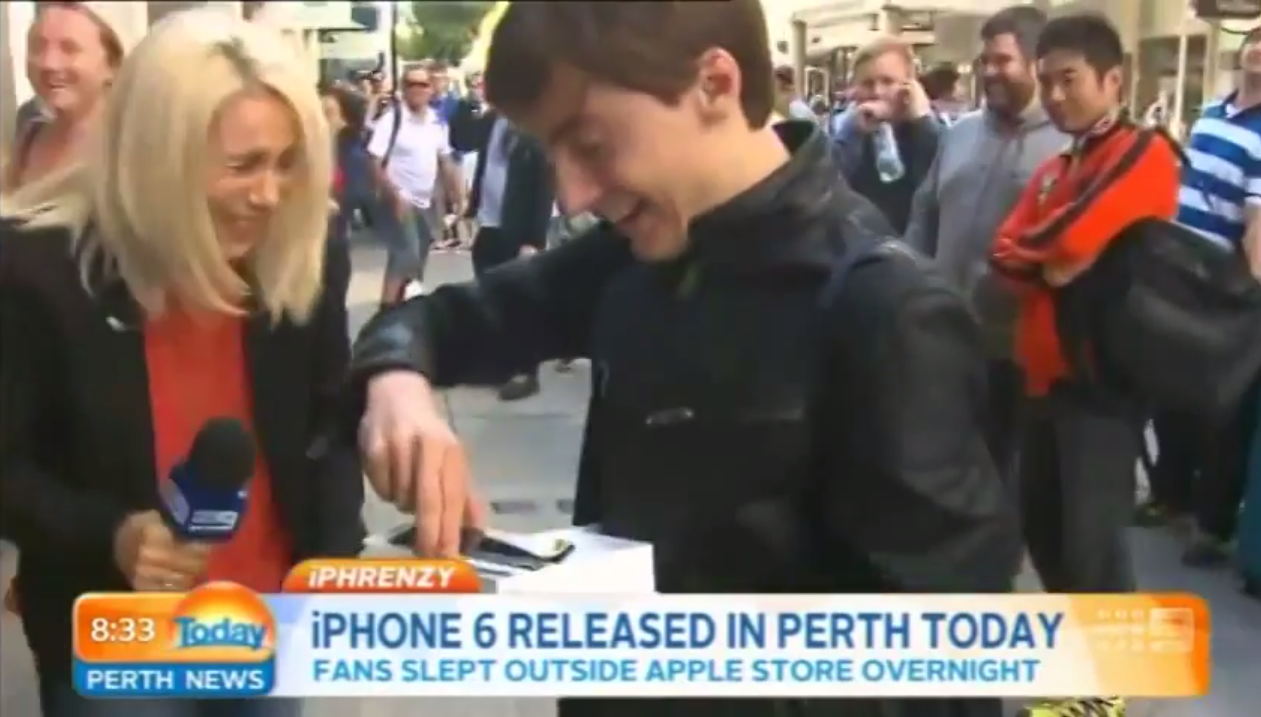 Un joven llamado Jack Cooksey fue el primer comprador de un iPhone 6 este viernes en Perth, Australia, pero digamos que no fue un gran honor ser el primero puesto que por mala suerte, se le cayó el teléfono al momento en que lo iba a mostrar a las cámaras.