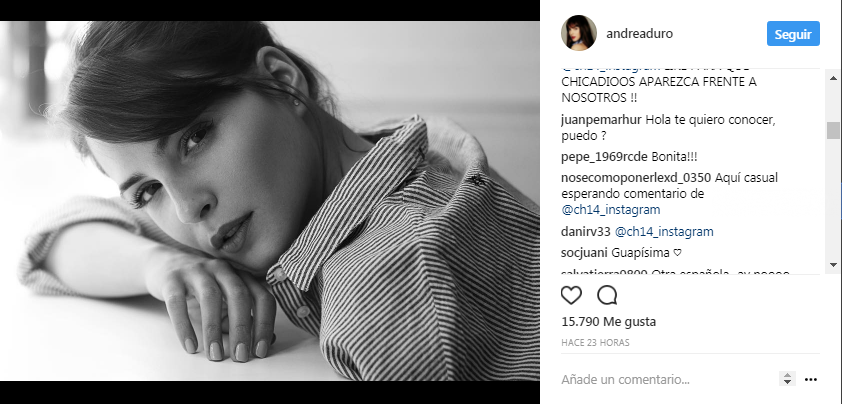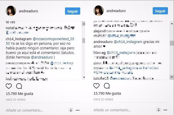 Y no tardó en responder: “Ya se los digo en persona, ¡por eso no había puesto ningún comentario! Jaja, pero bueno ¡ya está aquí el comentario! Saludos. (Estás hermosa @andreaduro)” y ella escribió: “Gracias mi amor” y un corazón.