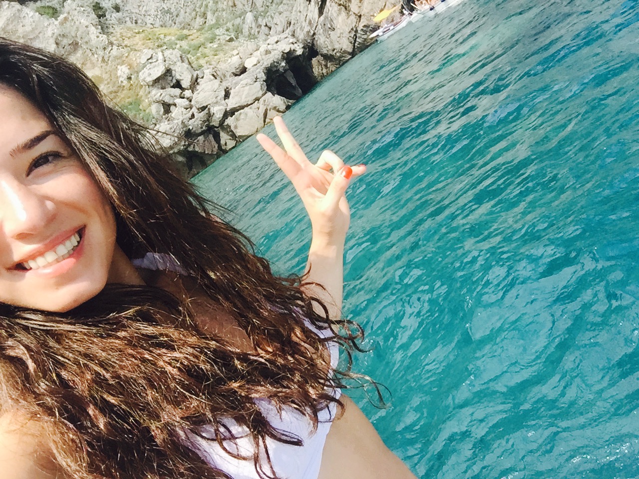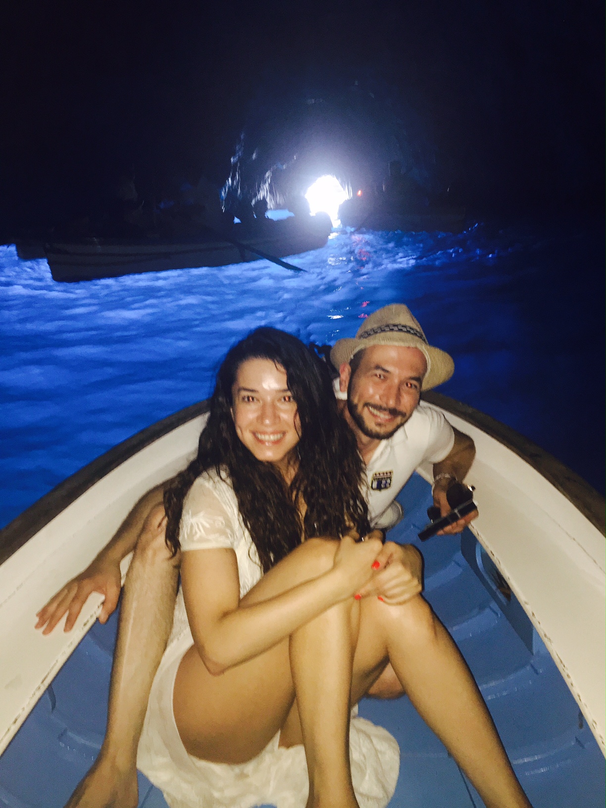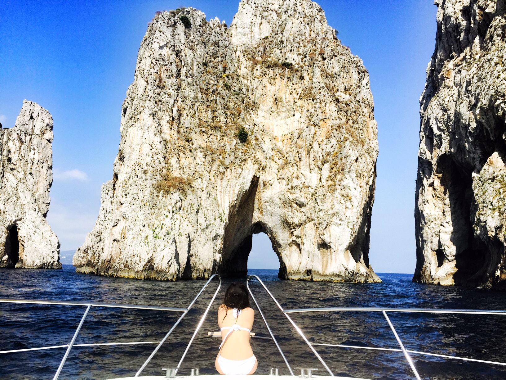 Nosotros decidimos rentar un barco y recorrer la costa para poder disfrutar hasta llegar a Capri. Conocimos la Grotta Azzurra, una gruta bellísima que gracias a su apertura y posición, permite la entrada de la luz del sol, la cual ilumina el agua desde abajo por lo que da un efecto como si el agua fuera azul fosforescente.
