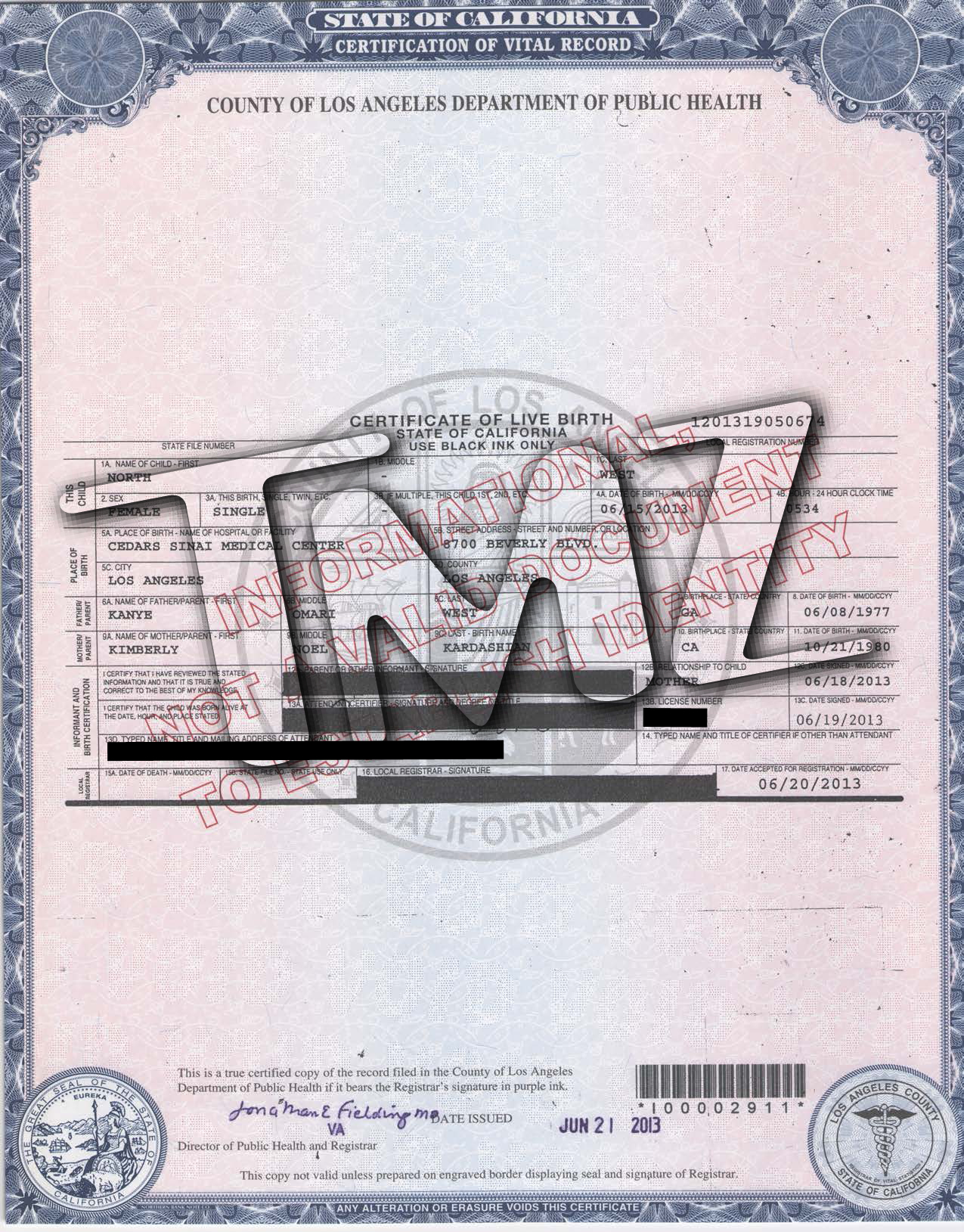 Este día el sitio de internet TMZ.com obtuvo una copia del acta de nacimiento de la niña, quien lleva por nombre: North West, rompiendo con la tradición de que el nombre de las integrantes de la familia empiece con “K”. Además, también nos enteramos que la familia quienes ya abandonaron el hospital a una semana del nacimiento, llamarán de cariño a su primogénita: ‘Nori’.