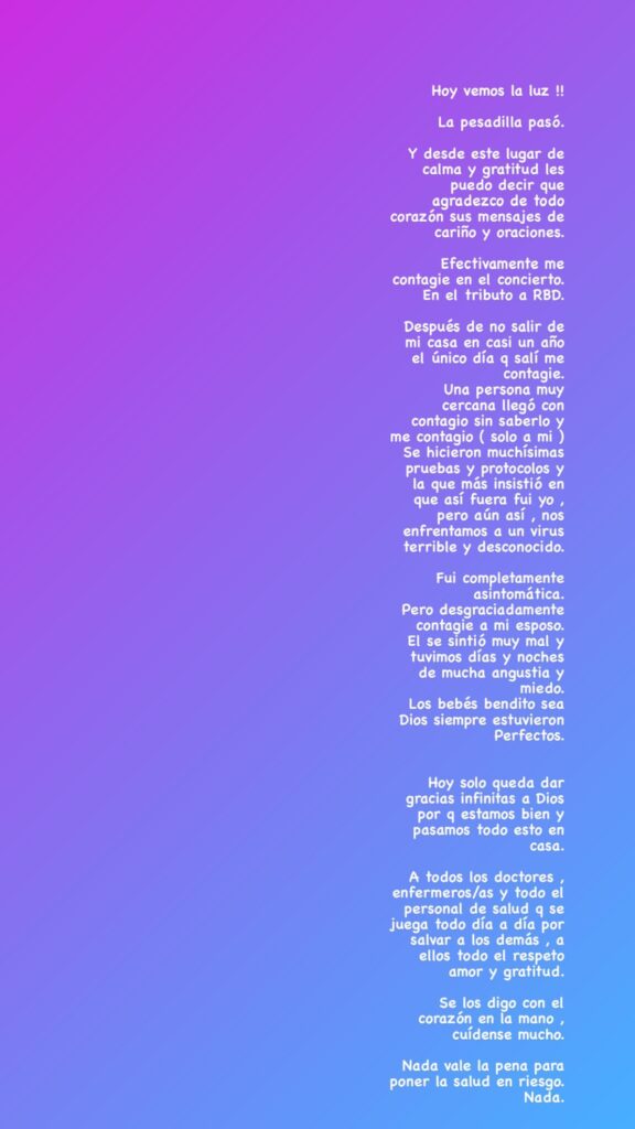 “Efectivamente me contagié en el concierto. En el tributo a RBD (…), una persona muy cercana llegó con contagio sin saberlo y me contagió (sólo a mí). Se hicieron muchísimas pruebas y protocolos y la que más insistí en que así fuera fui yo, pero aún así, nos enfrentamos a un virus terrible y desconocido”, se puede leer en la historia de Instagram.