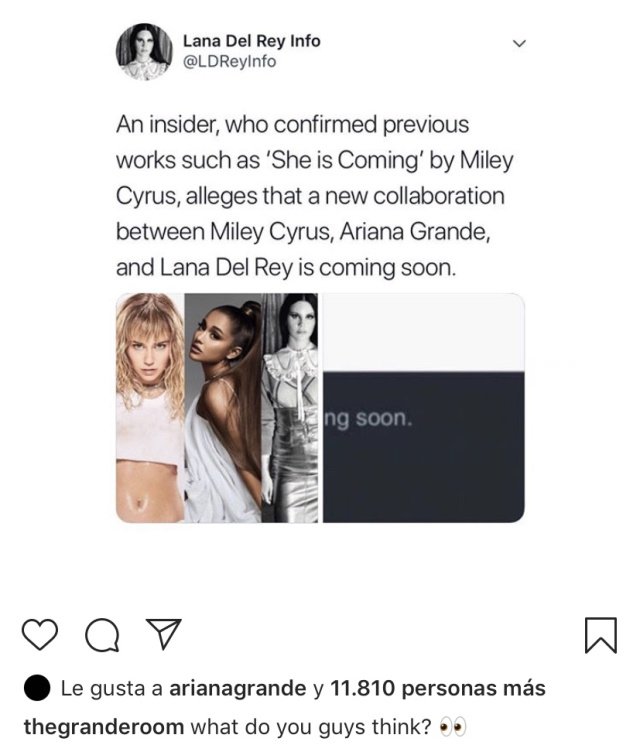 Ariana Grande fue la primera en emocionar a sus fanáticos al confirmar indirectamente, que tendría una colaboración con su gran amiga Miley Cyrus y Lana del Rey.