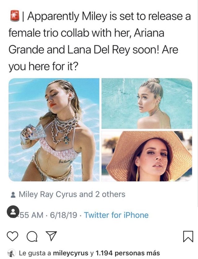 Ayer Miley Cyrus volvió a confirmar lo anterior, tras darle ‘like’ a dos publicaciones de fanáticos que confirmaban esta colaboración y la cual llegará muy pronto a nuestros oídos.