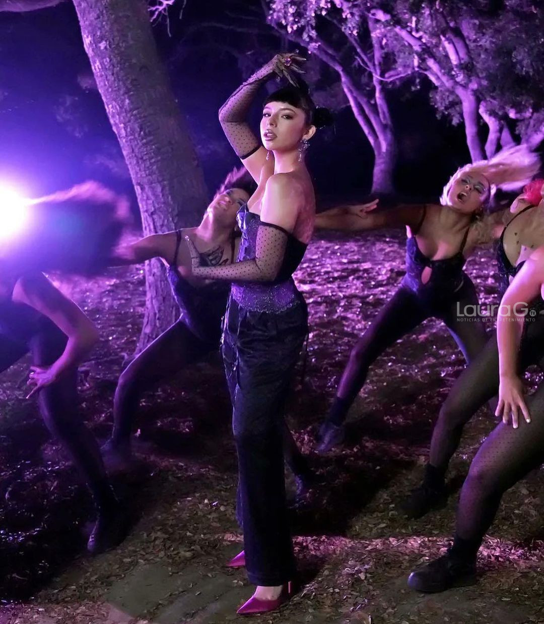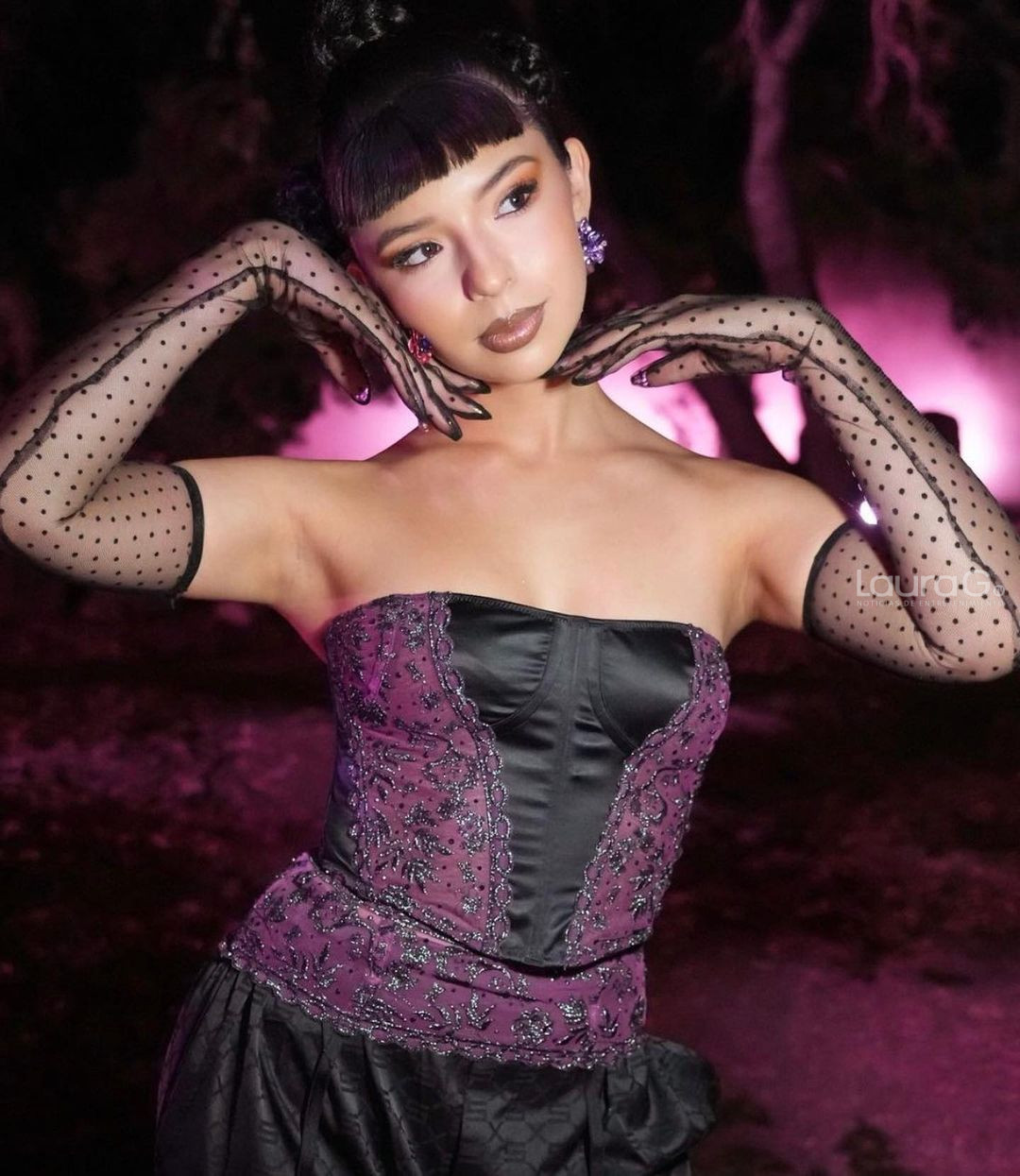Ángela Aguilar usó un corset morado, durante su paso por la pasarela que dejaba al descubierto ciertas partes de su cuerpo, llevó un peinado recogido por tres chongos, y además usó un flequillo corto.