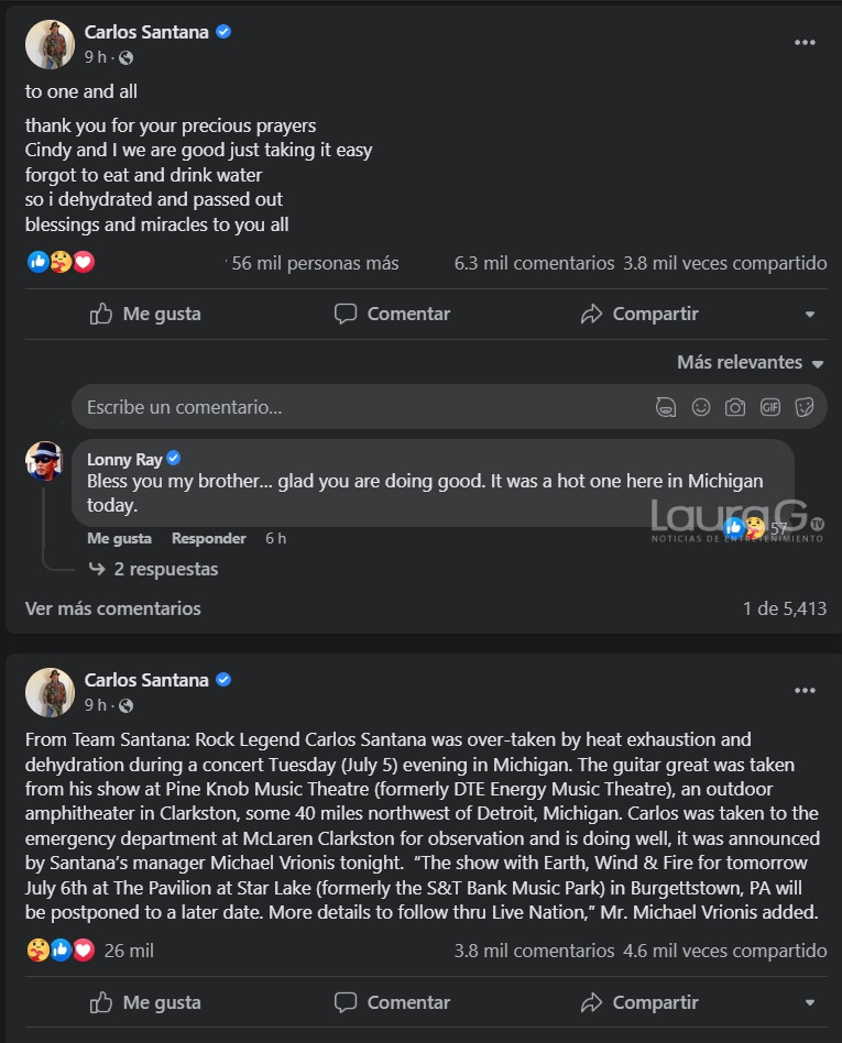 “Del equipo Santana: La leyenda del rock Carlos Santana fue superada por el agotamiento por calor y la deshidratación durante un concierto el martes (5 de julio) por la noche en Michigan. El gran guitarrista fue tomado de su espectáculo en Pine Knob Music Theatre (anteriormente DTE Energy Music Theatre), un anfiteatro al aire libre en Clarkston, a unas 40 millas al noroeste de Detroit, Michigan. Carlos fue llevado al departamento de emergencias de McLaren Clarkston para observación y está bien, según lo anunció el gerente de Santana, Michael Vrionis, esta noche. “El espectáculo con Earth, Wind & Fire para mañana 6 de julio en The Pavilion at Star Lake (anteriormente S&T Bank Music Park) en Burgettstown, PA se pospondrá para una fecha posterior. Más detalles a seguir a través de Live Nation”, agregó el Sr. Michael Vrionis”, se puede leer en la plataforma.