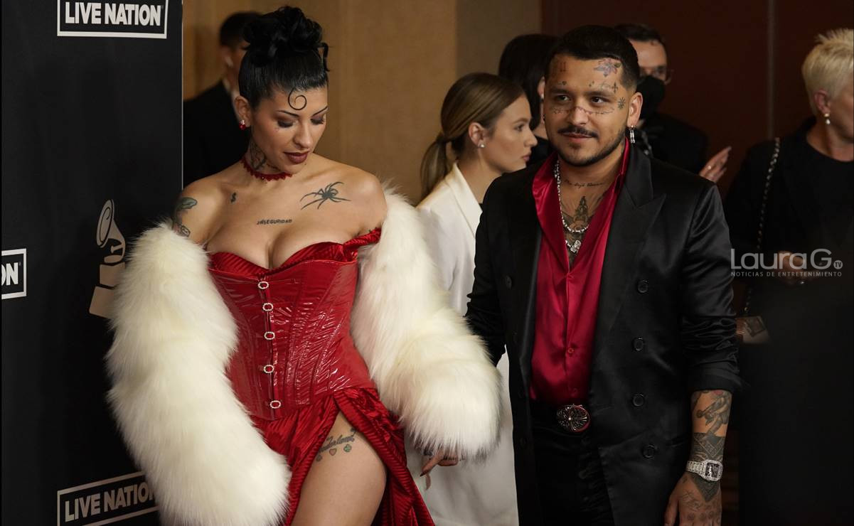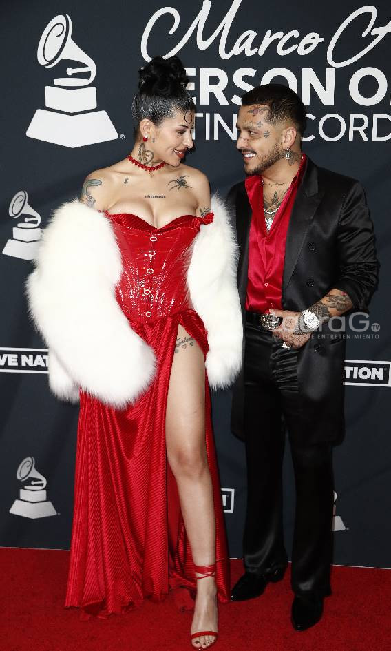 Mientras la rapera se lució vistiendo un elegante vestido largo en color rojo, corte strapless y enseñando la pierna izquierda por la apertura de la falda, Nodal iba con un traje negro y una camisa en color rojo de tela satín todas las prendas.