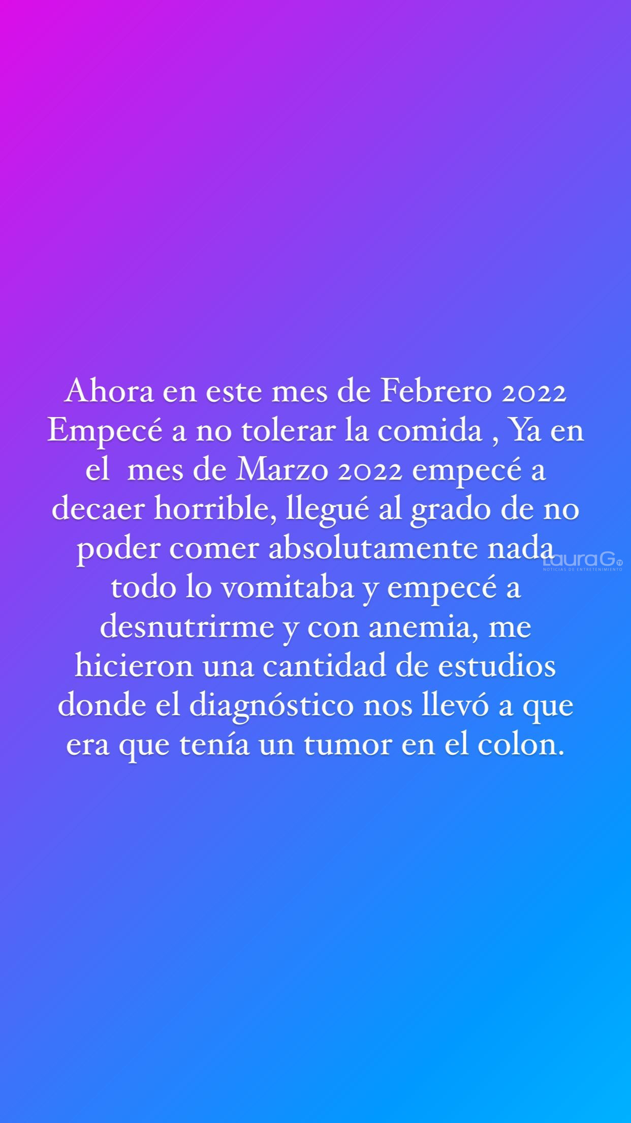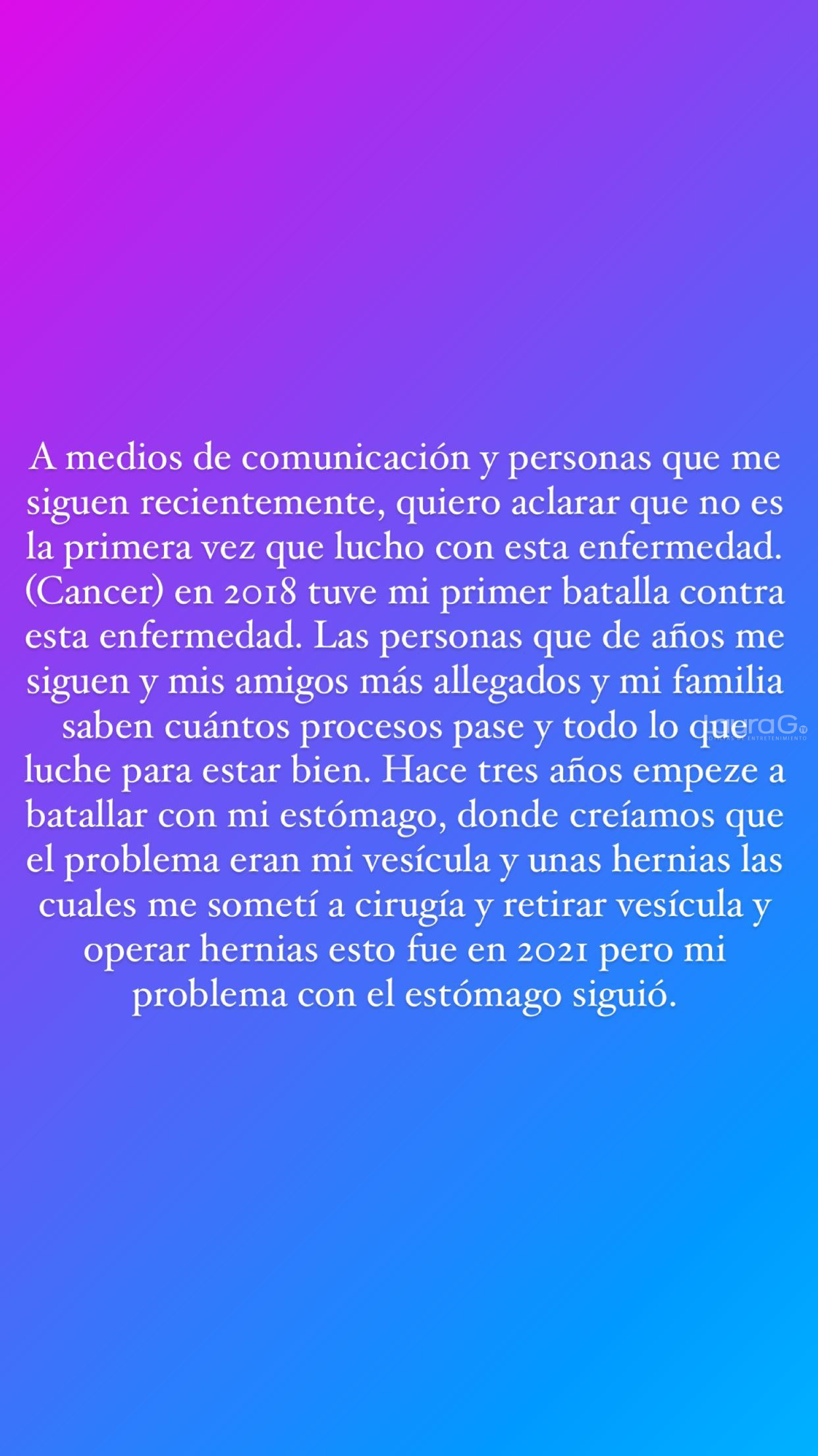 “No importa que tan ocupado estés, pero siempre haces todo por estar con nosotros en buenas y malas u cuando más te necesitamos, ya más de tres años de lucha, pero hoy si reconozco, que mis fuerzas ya no daban para más, necesitaba de sus abrazos y del gran amor que siempre me dan ustedes mi pequeña familia, pronto también esto pasará y mi salud seré más fuerte que nunca”, había escrito en su cuenta de Instagram.