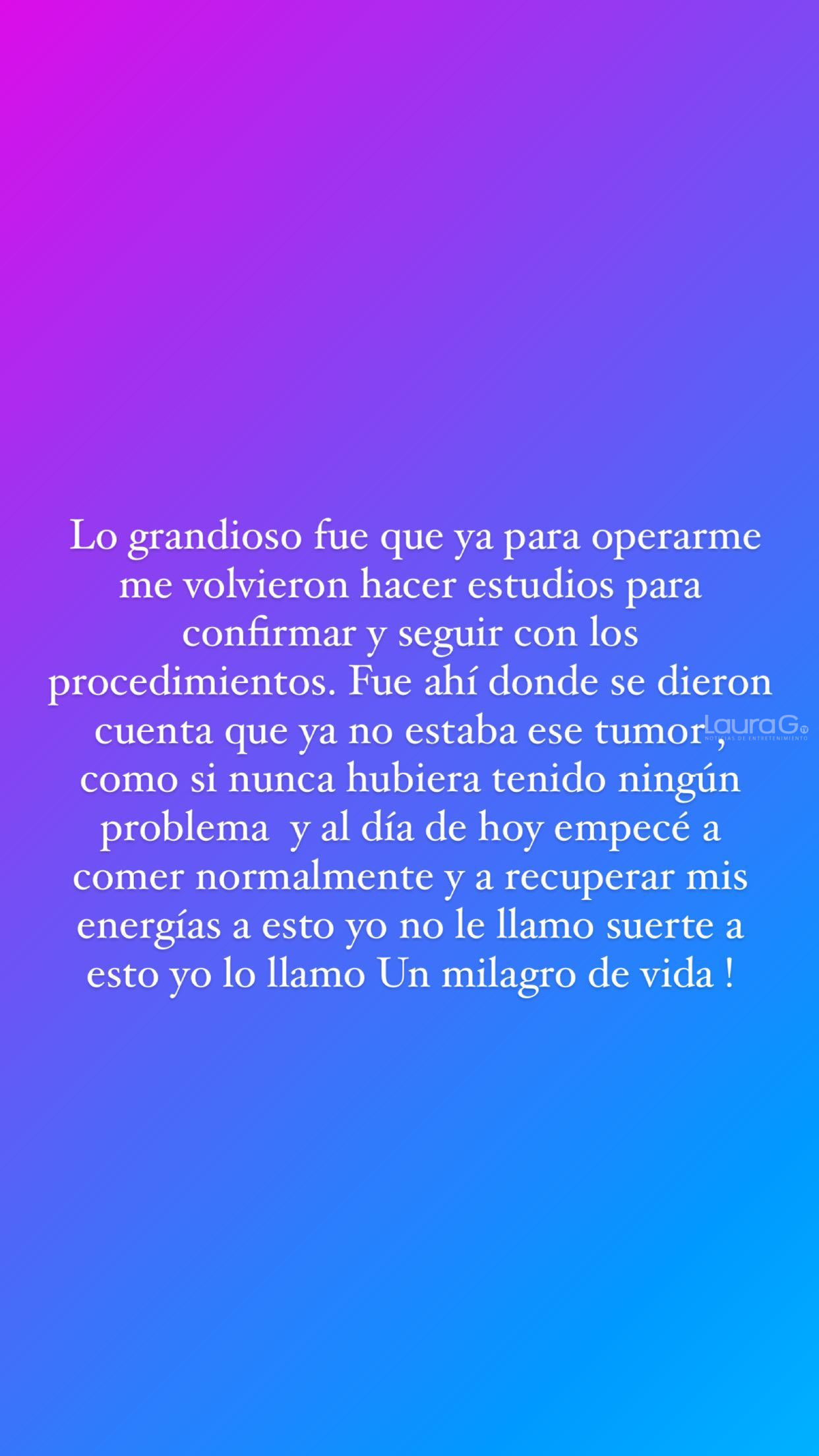 “Ya para operarme me volvieron hacer estudios para confirmar y seguir con los procedimientos. Fue ahí donde se dieron cuenta que ya no estaba ese tumor, como si nunca hubiera tenido ningún problema y al día de hoy empecé a comer normalmente y a recuperar mis energías a esto yo no le llamo suerte a esto yo lo llamo un milagro de vida”, señaló.