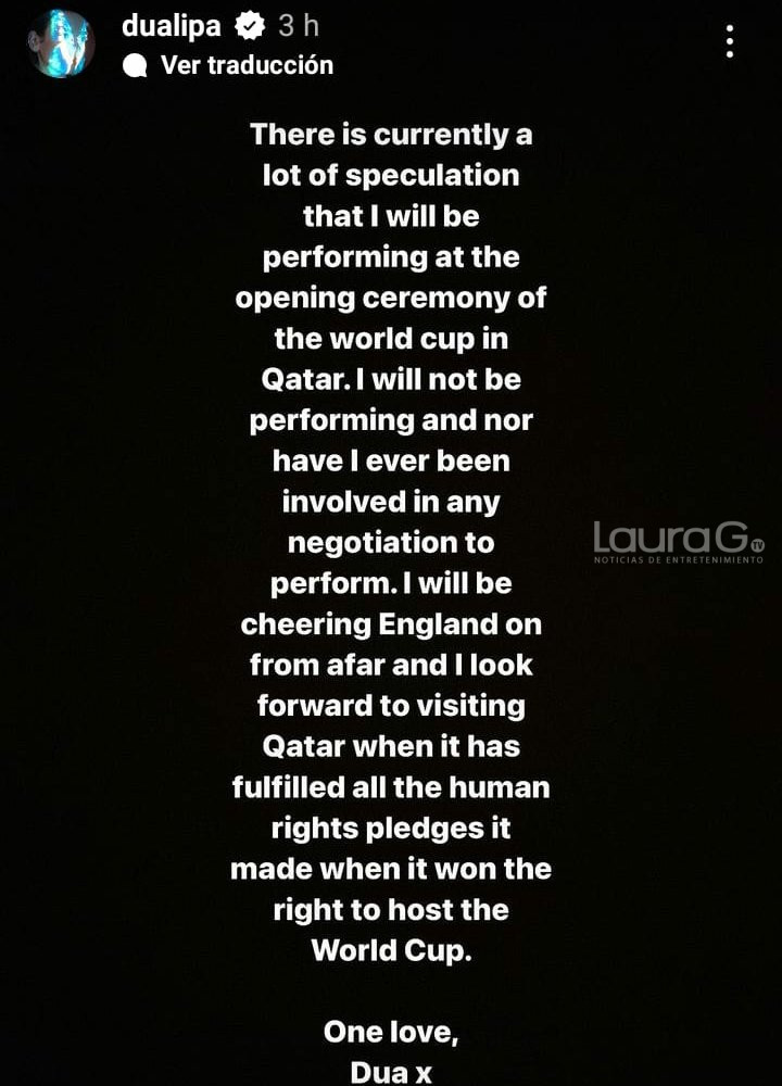 “Actualmente hay mucha especulación de que actuaré en la ceremonia de apertura de la copa del mundo en Qatar. No actuaré y nunca he estado involucrada en ninguna negociación para actuar. Estaré animando a Inglaterra desde lejos y mi deseo es visitar Qatar cuando haya cumplido con todas las promesas de derechos humanos que hizo cuando ganó el derecho de albergar la copa mundial. Con amor. Dua x”.