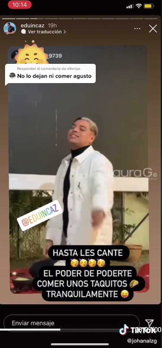 Incluso Eduin agradeció que lo dejaran comer a gusto, pues en su cuenta oficial de Instagram replicó el vídeo y respondió a un comentario que decía: “No lo dejan ni comer a gusto”. Caz escribió: “Hasta les canté. El poder comerte unos taquitos tranquilamente”. exclamó como agradecimiento.