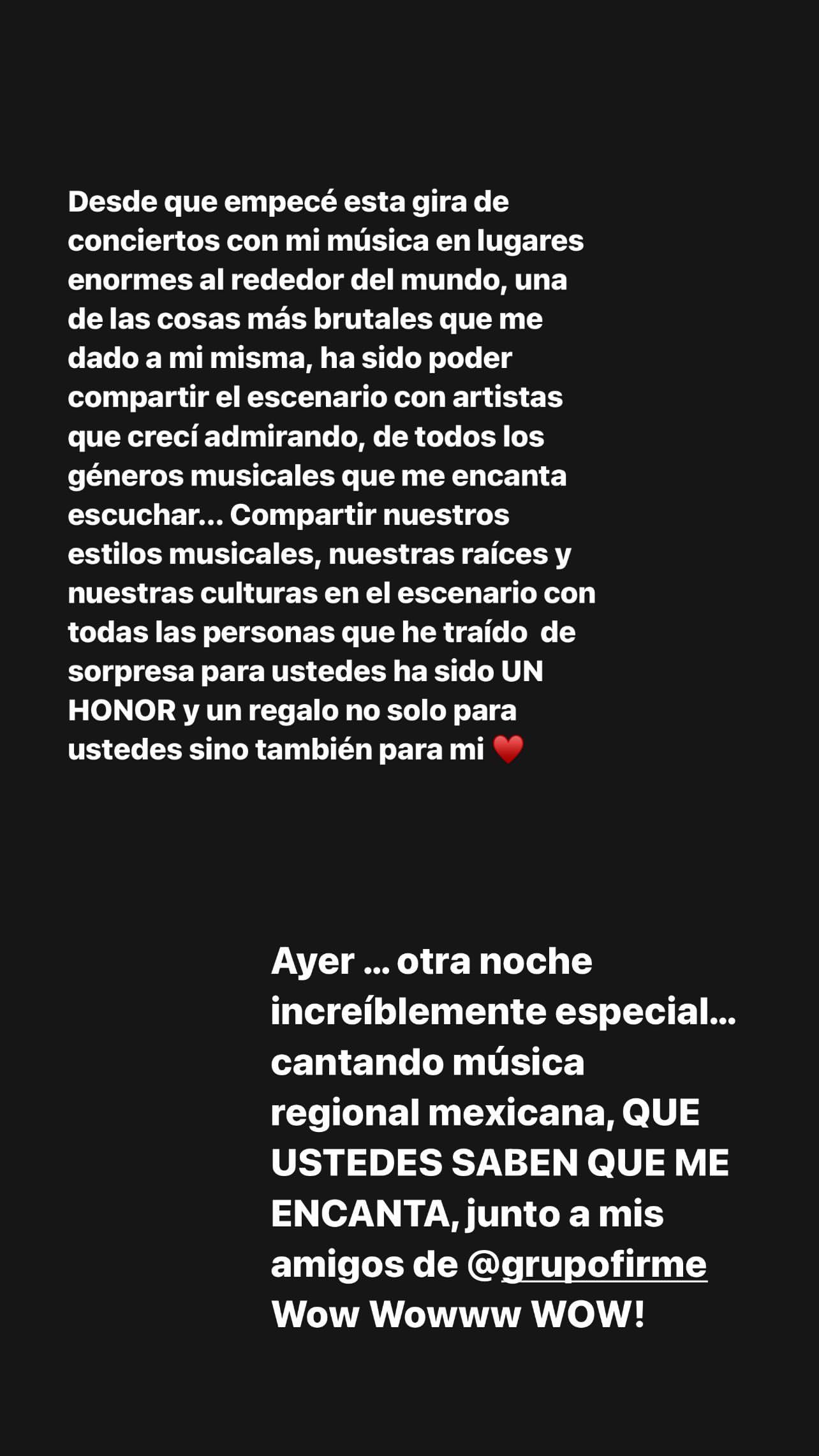 Además Karol G compartió en sus historias breves de Instagram que durante su gira ha tenido a un artista invitado para sorprender a sus más fieles seguidores y que se convirtió en un sueño cumplido al compartir el escenario con Grupo Firme, a quienes dice admirar.