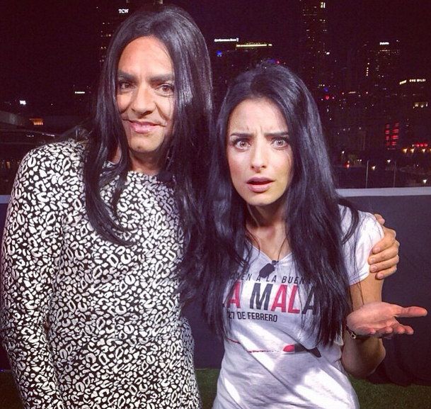 Con un vestido blanco con negro, una cabellera larga y de color negro, así como un poco de maquillaje bastaron para que Derbez luciera como la guapa Aislinn, y comenzarán con sus bromas preguntando ¿quién era la verdadera Aislinn?.