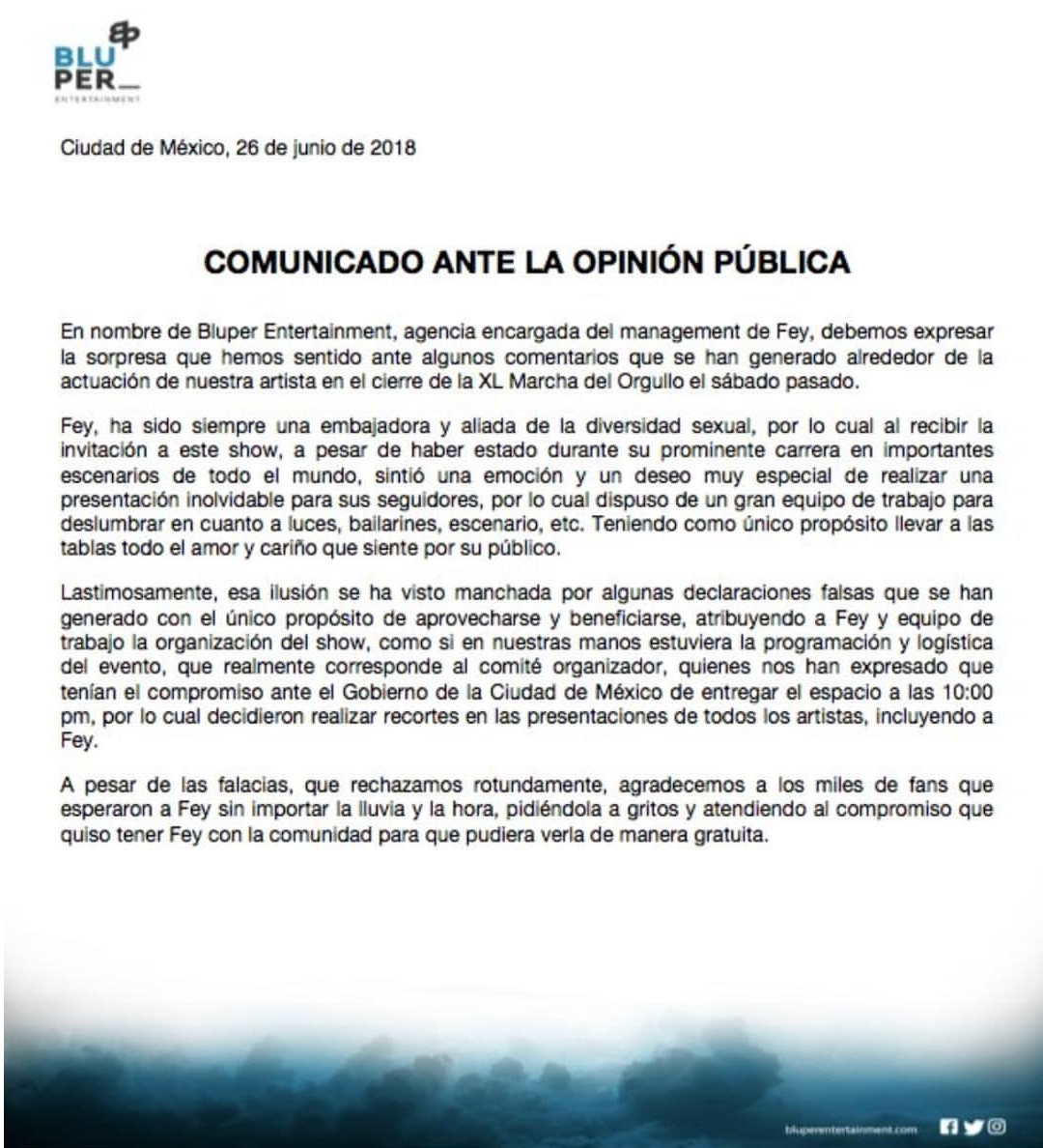 Finalmente Fey respondió a la polémica a través de sus Instagram Stories, deslindándose de la controversia, llamó de ‘falacias’ a las acusaciones en su contra y manifestó que la responsabilidad de todo recae en el comité organizador, quienes debían entregar el espacio a las 22 horas.