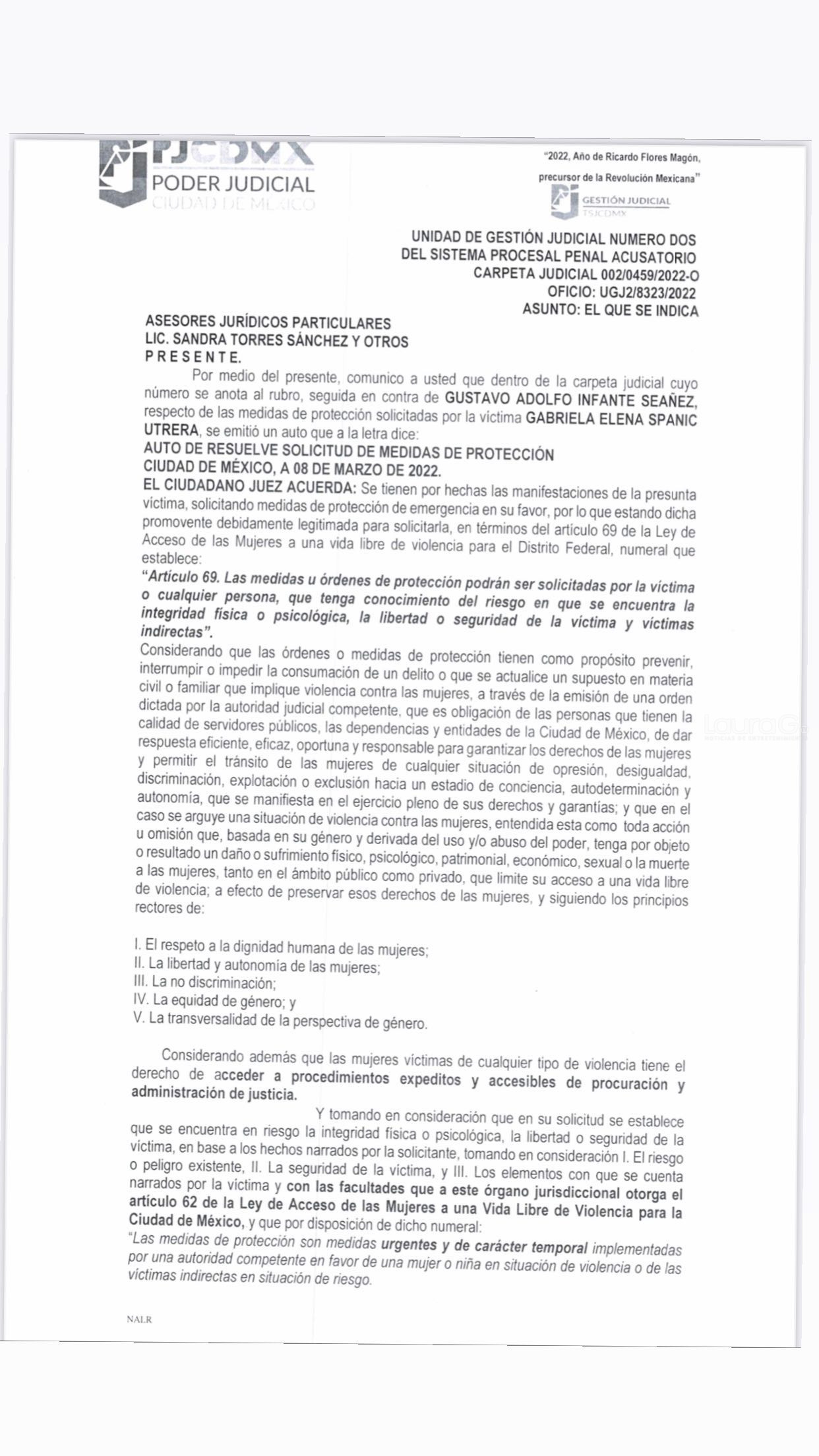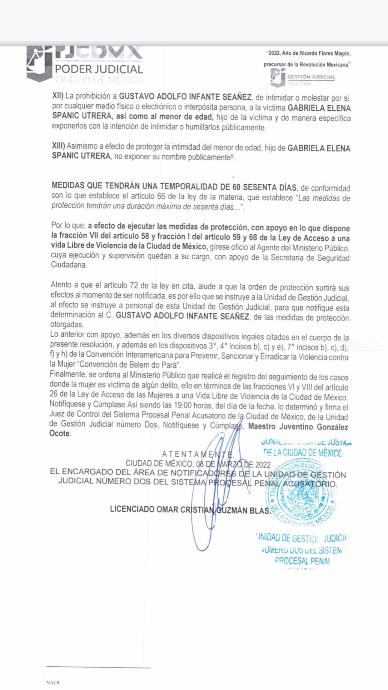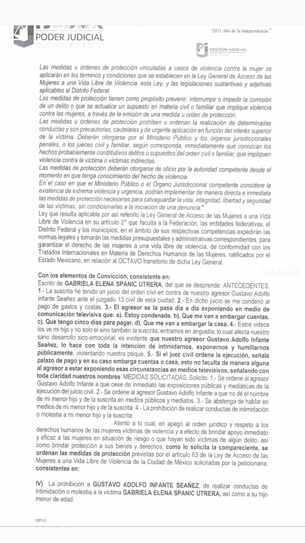 “Después de tantos atropellos e injusticias durante años, debo comunicar a la opinión pública y a mis ángeles, que los tribunales mexicanos han decidido respaldar mi petición para evitar que mi hijo y yo, sigamos siendo intimidados y humillados públicamente por el periodista Gustavo Adolfo Infante, quién desde hace muchos años ha decidido exponerme como una mujer loca, de poca dignidad y falta de talento con el propósito de arruinarme como actriz y mujer”, detalló Gaby Spanic en su cuenta de Instagram.