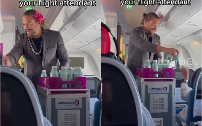 La usuaria identificada como Kylee Yoshikawa bajo el usuario @livinglikekylee compartió el clip bajo la siguiente descripción: “Cuando Jason Momoa es tu auxiliar de vuelo”, mientras el actor reparte agua con una flor en la cabeza.