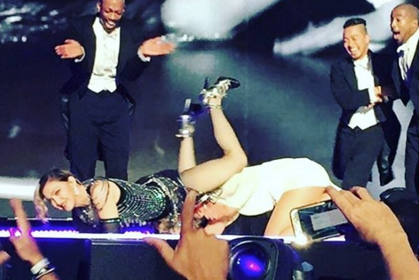 La latina de 46 años publicó una imagen donde la vemos posando con un par de colegas en el backstage después del show.