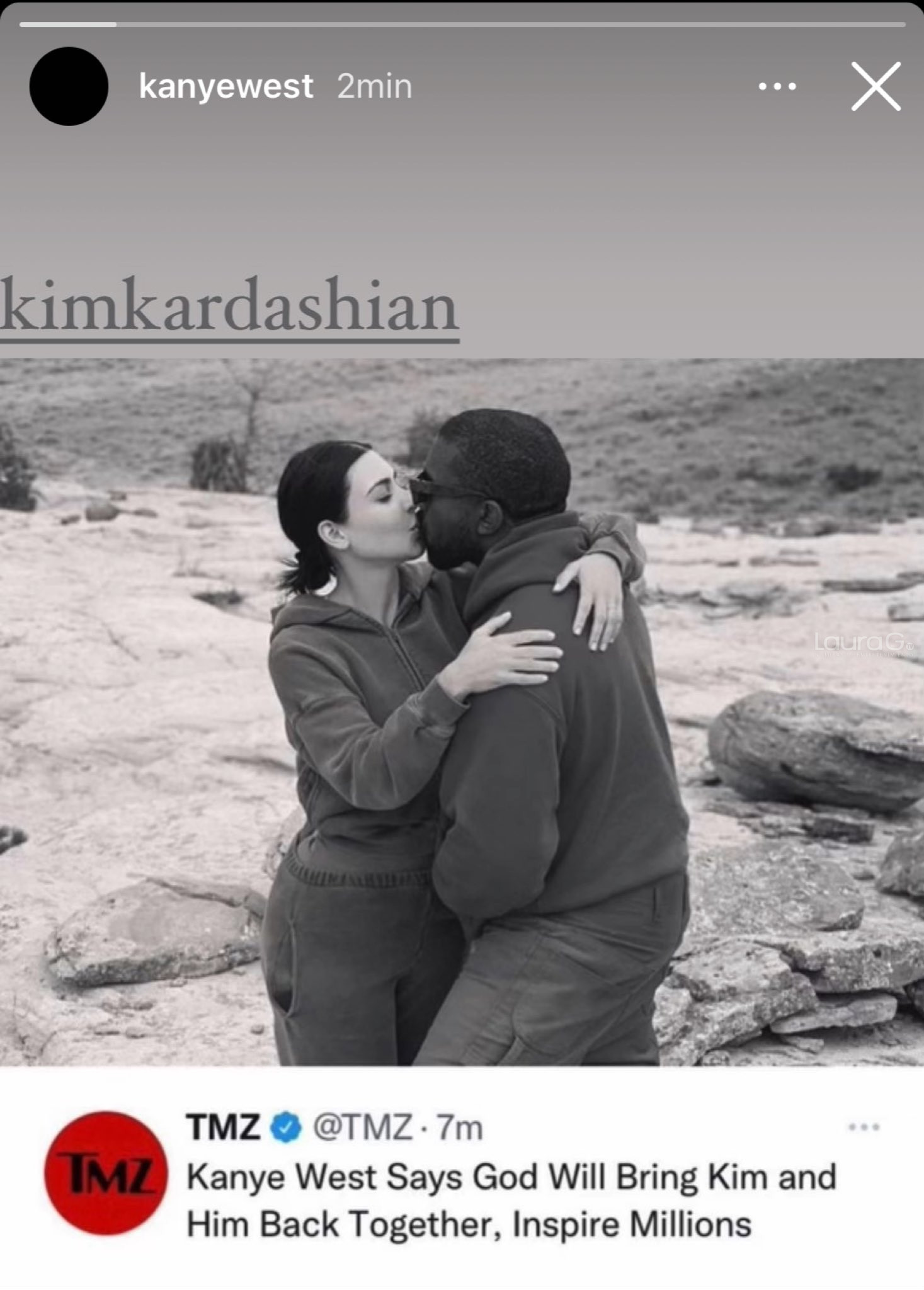 Todo lo anterior se da luego de que West compartiera una foto besando a Kim a medida que el “romance” con Pete Davidson comienza a calentarse. Kanye retomó la siguiente publicación de del medio TMZ que se titula: “Kanye West dice que Dios volverá a unir a Kim y a él”.