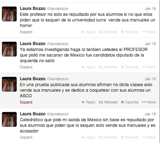 Primero fue a través de twitter donde Bozzo dirigió algunos tuits para Vázquez Flores: “Catedrático que pide mi salida de Mexico sin base es repudiado por sus alumnos que piden que lo saquen solo vende sus manuales y es acosador” escribió la señorita Laura, quien además reveló que este personaje ha sido candidato a puestos políticos sin resultar ganador.