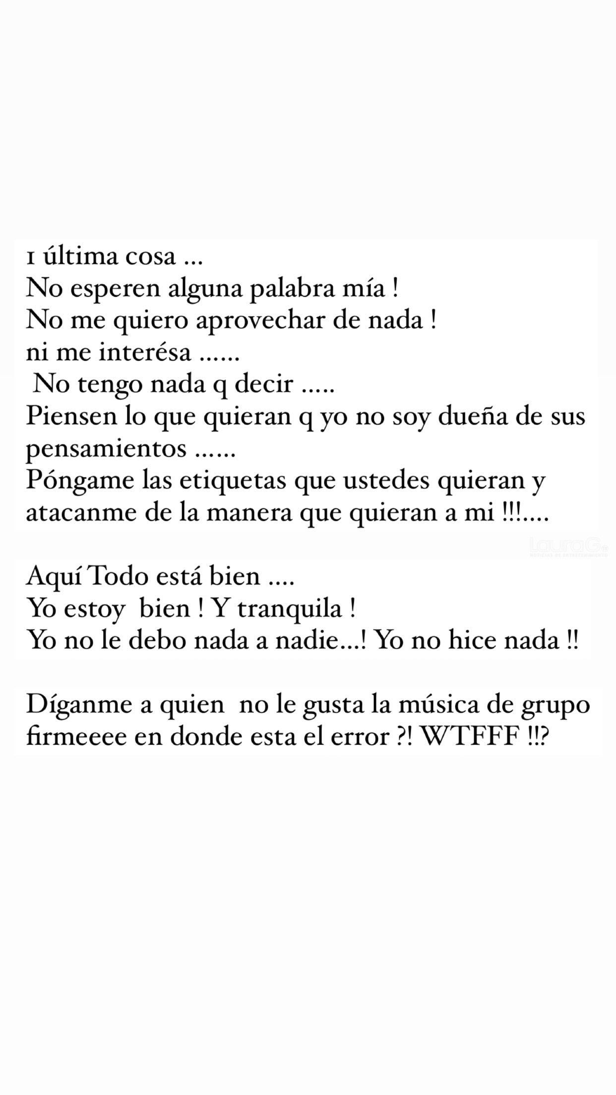 “No tengo nada qué decir. Piensen lo que quieran que yo no soy dueña de sus pensamientos. Póngame las etiquetas que ustedes quieran y atacanme de la manera que quieran ami. Aquí todo está bien. Yo estoy bien y tranquila. Yo no le debo nada a nadie. Yo no hice nada. Díganme a quien no le gusta la música de Grupo Firmeee en dónde está el error WTF?”, escribió la joven.