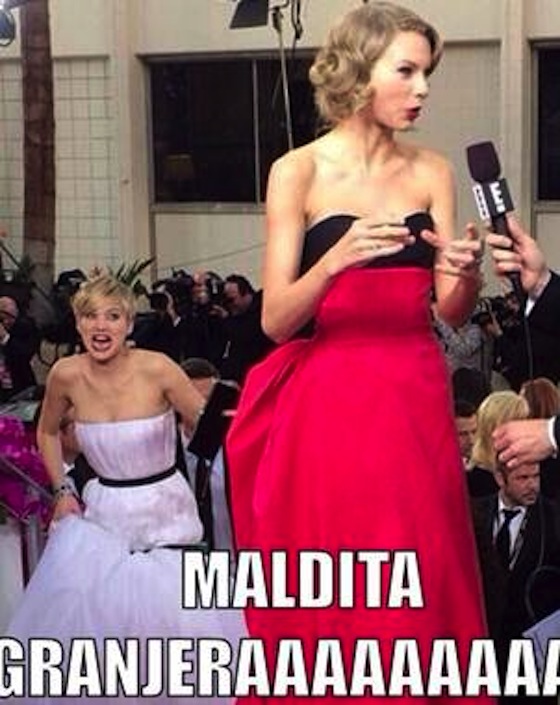 Pero éso no fue todo porque la escena de Lawrence con la cara furiosa cuando “intentaba” arrojar a Taylor Swift por las escaleras mientras era entrevistada en la alfombra roja por Ryan Seacrest también generó chistes en internet titulando a las fotografías “MALDITA GRANJERA”; En realidad se trataba de una broma y ambas estrellas se abrazaron.