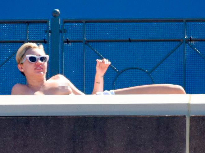 Víctima de los paparazzi, la intérprete fue captada cuando salió al balcón de un hotel en un short blanco y una playera que posteriormente se quitó para disfrutar de un baño de sol.