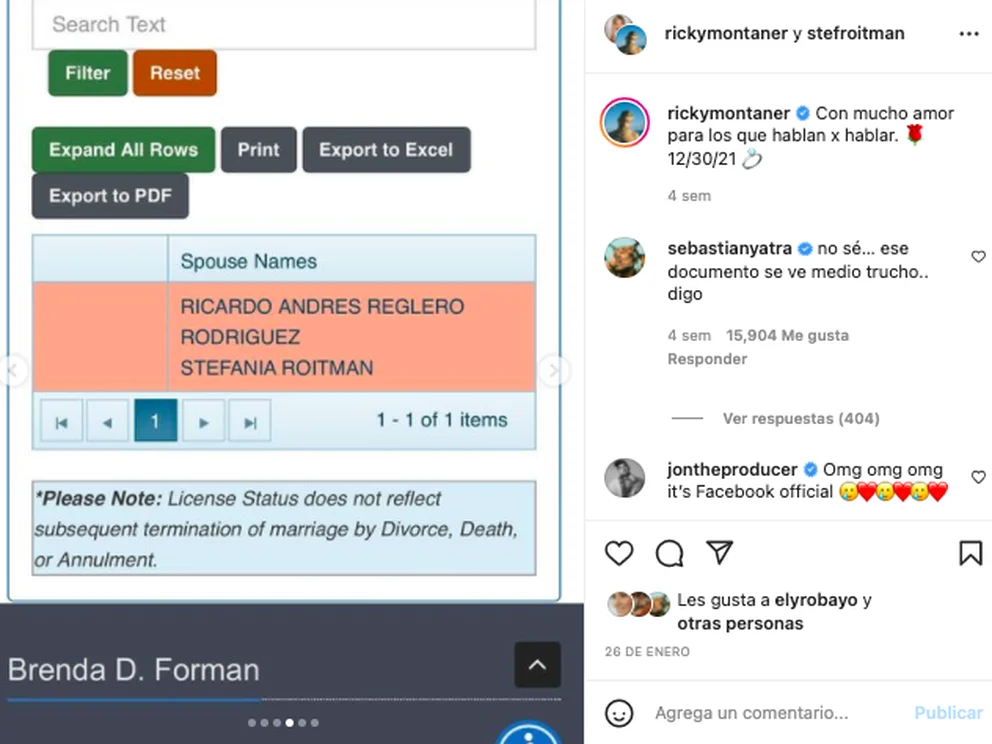 Aunque se piensa que el apellido Montaner podría transcender en el legado familiar, Ricky Montaner mostró, para silenciar los rumores de un falso matrimonio con Stefania Roitman y el certificado que comprobó la unión marital se ve el primer apellido de Ricardo Montaner no es este, sino que lleva el Reglero por delante.