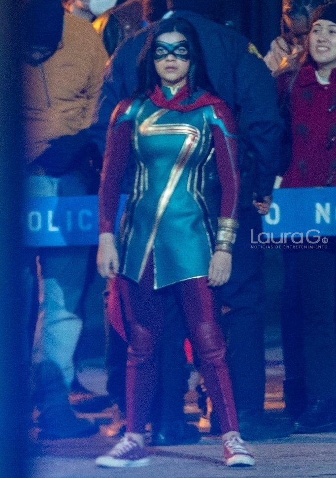 Y ahora circulan en la web las primeras imágenes de Iman Vellani en el set de grabación revelando el primer vistazo al traje de Ms. Marvel para Disney Plus. Fue este viernes que el portal Just Jared captó a la joven actriz durante un rodaje nocturno en las calles de Atlanta.