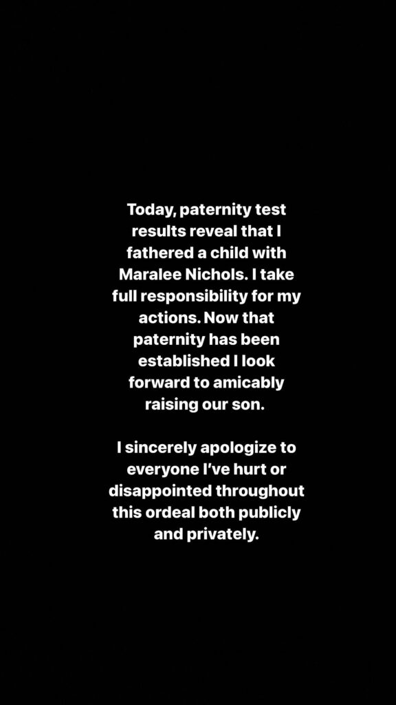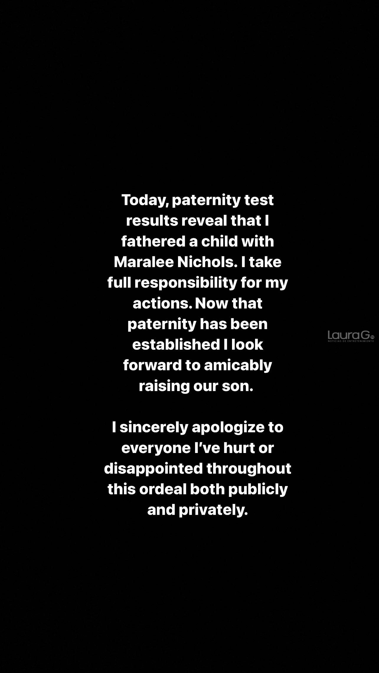 “Hoy, los resultados de las pruebas de paternidad revelaron que soy el padre del hijo de Maralee Nichols. Tomo completa responsabilidad por mis acciones. Ahora que se ha establecido la paternidad, espero criar amistosamente a nuestro hijo. Me disculpo sinceramente con todos lo que he lastimado o decepcionado a lo largo de esta terrible experiencia, tanto en público como en privado. Khloe, no te mereces esto. No te mereces el dolor y la humillación que te he causado. No te mereces la forma en que te he tratado a lo largo de los años. Ciertamente, mis acciones no se han alineado con la forma en que te veo. Tengo el mayor respeto y amor por ti. Independientemente de lo que puedas pensar una vez más, lo siento muchísimo”.