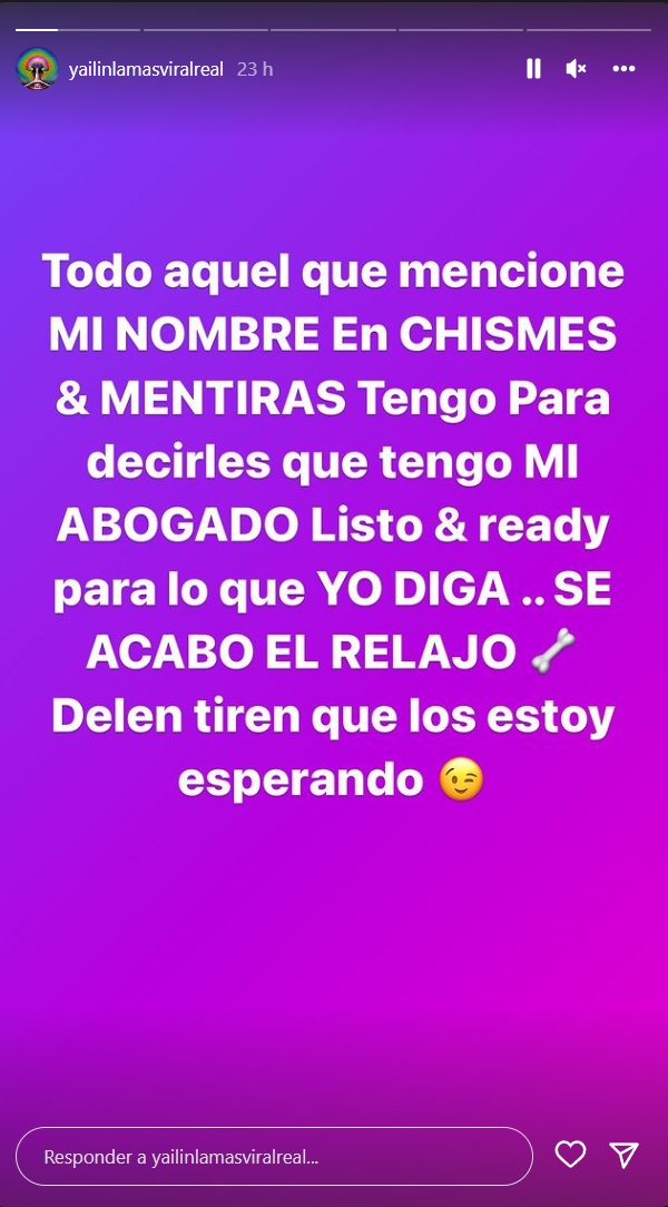“Todo aquel que mencione mi nombre en chismes y mentiras tengo para decirles que tengo mi abogado listo para lo que yo diga. Se acabo el relajo. Delen, tiren que los estoy esperando”, indicó la cantante.