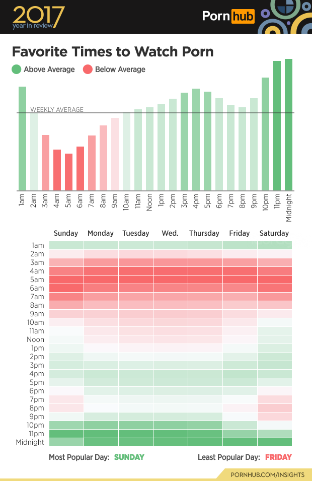 La hora preferida para visitar el sitio es a media noche y 1 am, siendo el domingo el día más popular para ver porno.