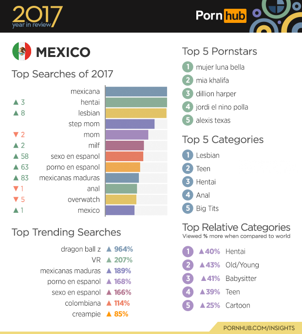 En el resumen anual del sitio Pornhub, México es el segundo mayor consumidor de Dragon Ball Z y Mujer Luna Bella es la mejor estrella porno, además que la búsqueda más fuerte entre los mexicanos es “sexo en español” o “porno en español”.