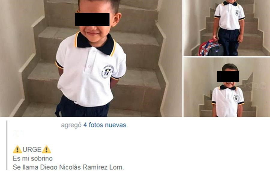 En una publicación de Facebook se dio a conocer que el menor estaba desaparecido junto a un texto donde dieron a conocer el nombre del menor, se trataba de Diego Nicolás Ramírez Lom, quien sería recogido por su abuelo en el Jardín de Niños de Pensiones Civiles del Estado No. 1044; pero al acudir no se encontraba en el lugar.