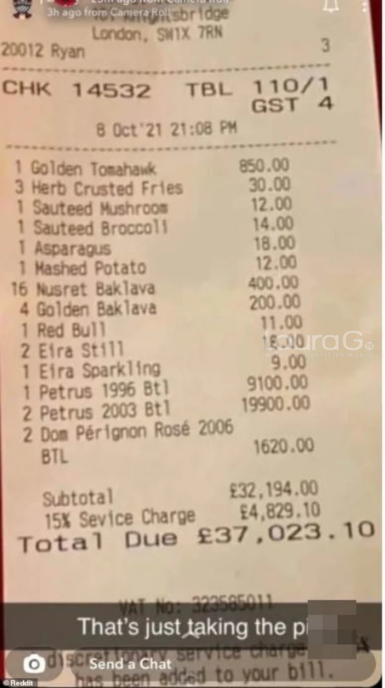 En el ticket se aprecia que el platillo más caro que ofrece este lugar es un filete denominado, tomahawk, el cual tiene un costo de más de 23 mil 700 pesos que está bañado en oro de 24 quilates. Además cuatro bebidas RedBull las venden por mil 229 pesos.