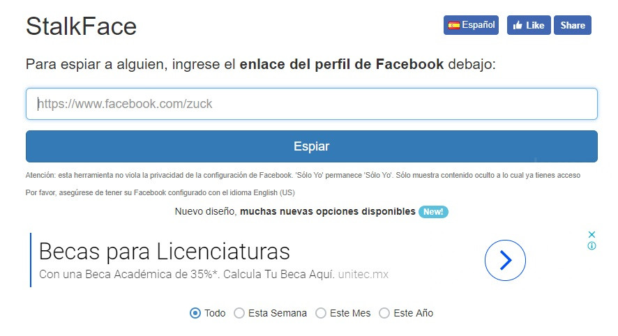 Es a través de una aplicación llamada ‘StalkFace’, una herramienta que te permitirá espiar el perfil de otra persona, sin embargo el sitio no pertenece a Facebook y no podrás ver la información que el usuario ha bloqueado como ‘Solo Yo’.