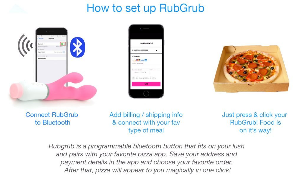 Rubgrub, es el nuevo vibrador creador y lanzado por CamSoda, quienes se han encargado de conectar a este nuevo mejor amigo de quien lo use con Bluetooth, una vez enlazados y que se empiece a utilizar, los repartidores estarán alerta para cuando hayan llegado al orgasmo y llevarte de comer rápidamente.