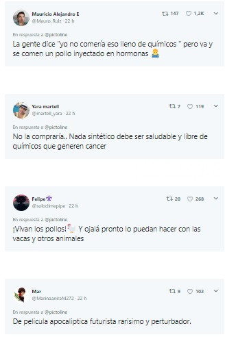 El director ejecutivo de Just aseguró que se requieren dos días para “producir un nugget de pollo en un pequeño biorreactor, usando una proteína para estimular la multiplicación de las células, algún tipo de soporte para dar estructura al producto y un medio de cultivo para alimentar la carne a medida que se desarrolla”, agregó que este producto llegará a restaurantes a finales de este año.