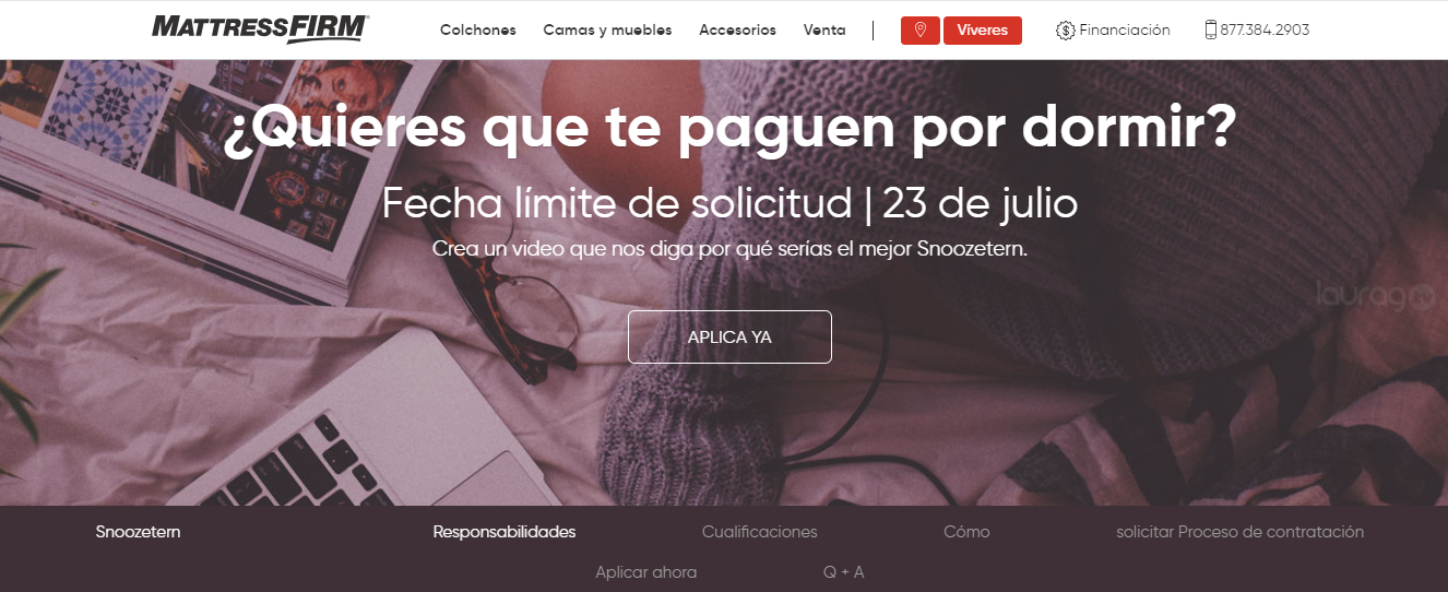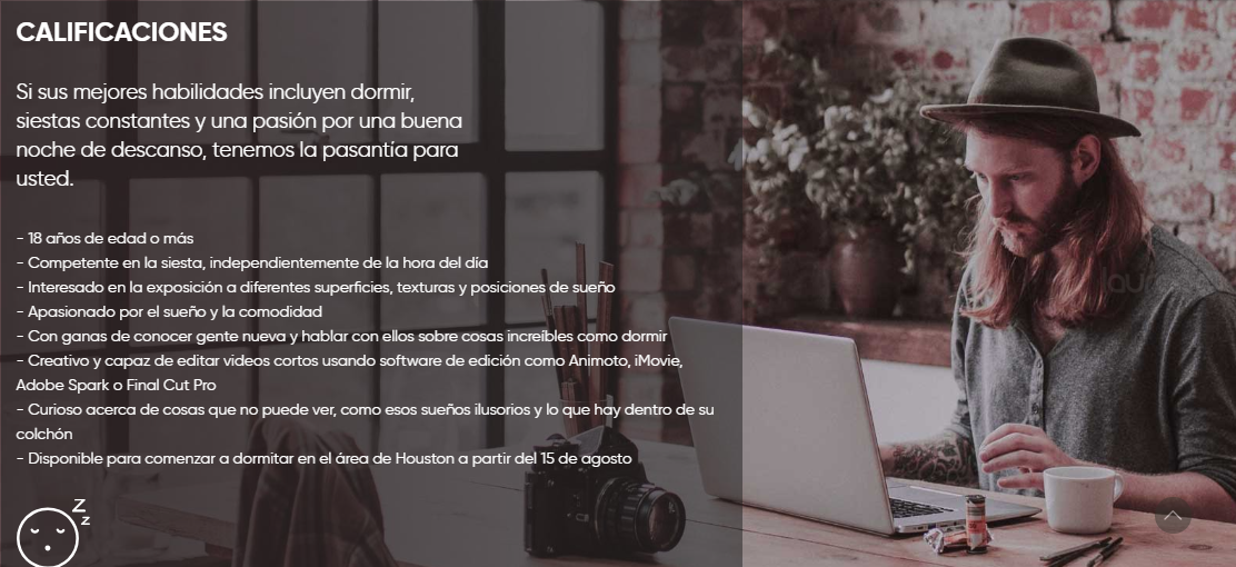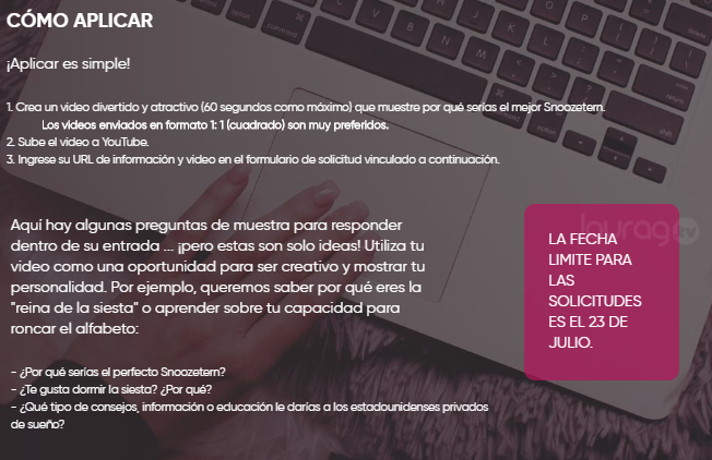 Con sede en Houston, la empresa pondrá a prueba el trabajo de tus sueños,el principal objetivo de esta marca es que este empleado sea testigo de su producto nuevo un colchón llamado ‘Snoozetern’, que quiere decir ‘Siesta eterna’ y dar evidencia de su experiencia por medio delas redes sociales.