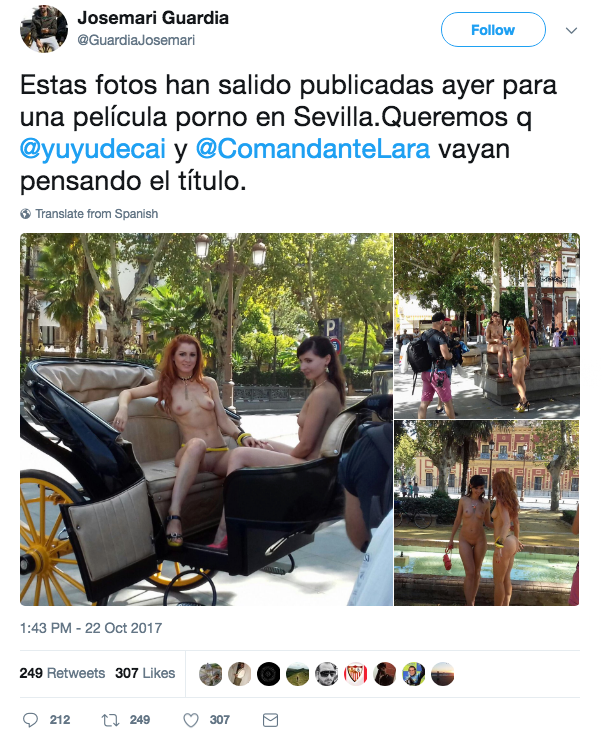 Al principio se denunció la presencia de dos mujeres que recorrían las calles de Sevilla, completamente desnudas, pero luego se descubrió que eran dos estrellas porno, realizando un filme lésbico.