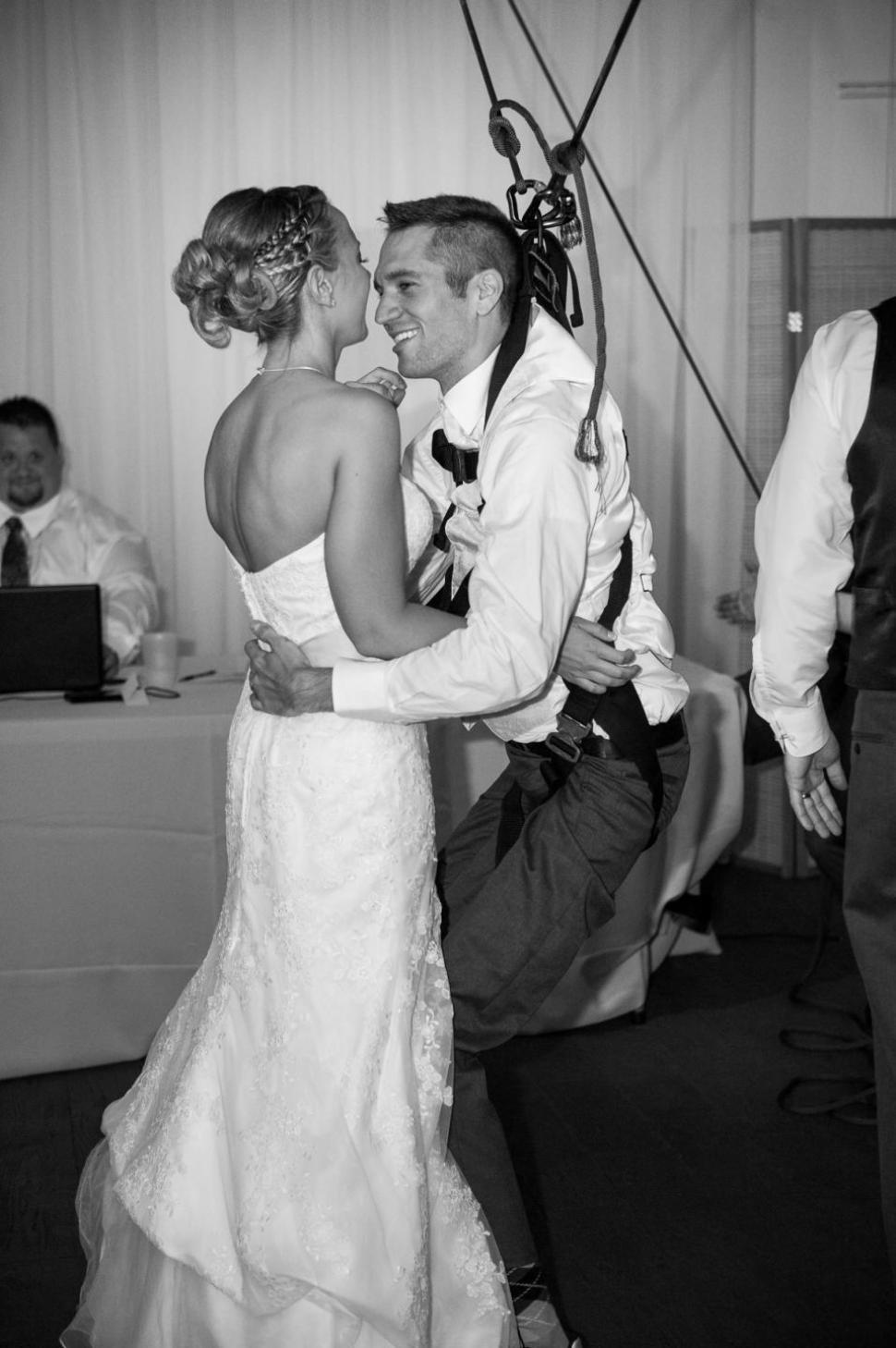Mientras su esposa Michelle Johnson se estaba ajustando el vestido de novia, los amigos de Joey Johnson lo sujetaron con un sistema de arnés que le permitió levantarse de su silla de ruedas.