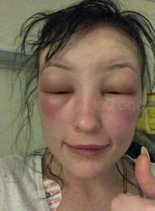 Luego de dos días, confirmó a Daily Mail que despertó sintiendo que “su cabeza estaba en llamas”, además estaba hinchada de la cara y no podía abrir los ojos por la reacción.
