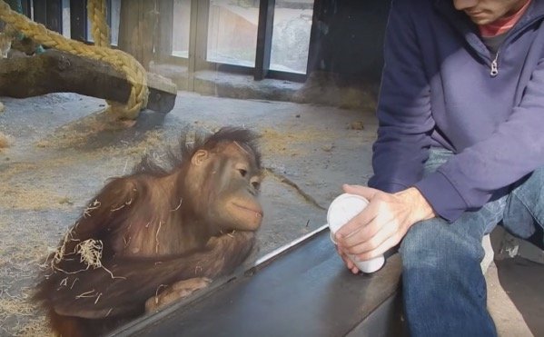 En un video que circula en las redes podemos ver a un chico realizando un simple truco de magia frente al orangután, quien atentamente observa tras un ventanal dentro de un zoológico en Barcelona.