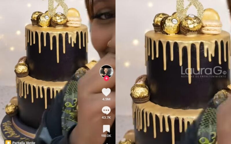 En el video se aprecia el hermoso pastel de dos pisos que deseaba tener, el cual estaba decorado en color negro y dorado con chocolates de Ferrero Roche y un número 18 en la parte superior.