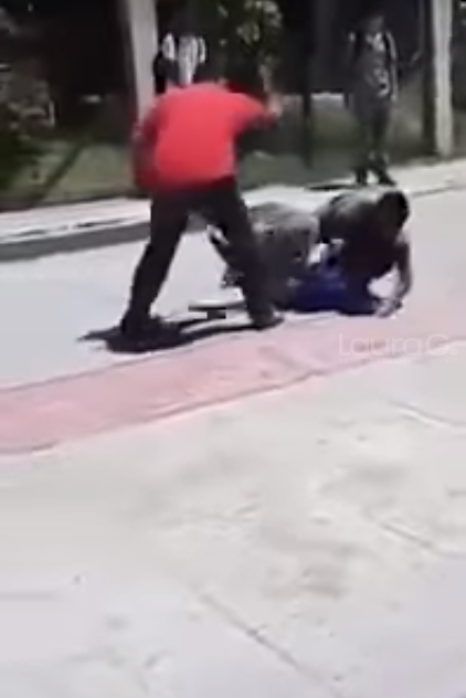 En el clip se puede ver como dos jóvenes aproximadamente de 14 o 15 años, tras hacerse de palabras comenzaron un fuerte enfrentamiento mientras sus compañeros los observan.