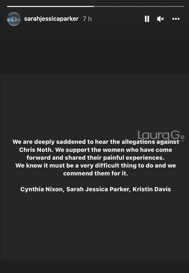 “Nos entristece profundamente escuchar las acusaciones contra Chris Noth. Apoyamos a las mujeres que se han presentado y compartido sus dolorosas experiencias. Sabemos que debe ser algo muy difícil de hacer y las felicitamos por ello. Sarah Jessica Parker, Kristin Davis y Cynthia Nixon”.
