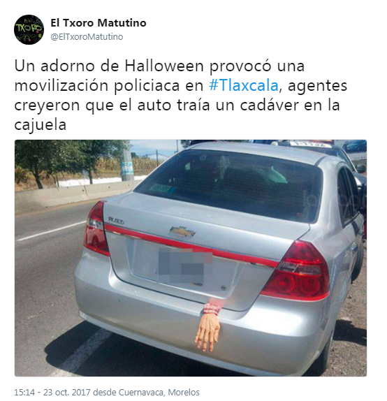 Finalmente los elementos de la policía rectificaron que se trataba de una mano de plástico, mientras que el conductor alegó que la puso con intención y como adorno por las fiestas de Halloween y Día de Muertos.