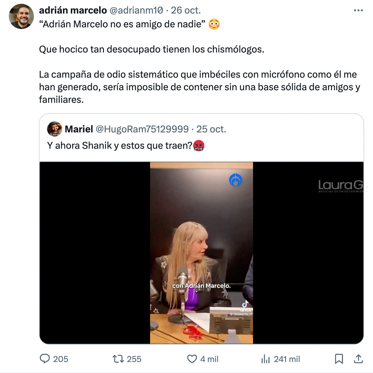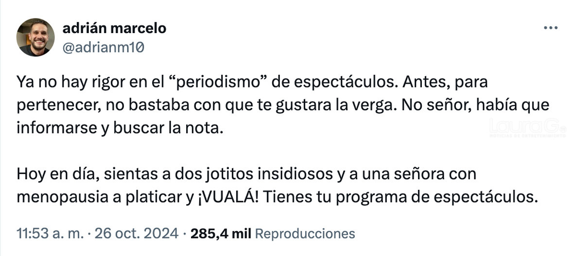 Adrián no solo replicó con insultos, llamando “imbéciles con micrófono” a sus críticos, sino que también lanzó una crítica al estado del periodismo de espectáculos actual: “Ya no hay rigor en el ‘periodismo’ de espectáculos. Antes, para pertenecer, no bastaba con que te gustara la verga. Hoy en día, sientas a dos jotitos insidiosos y a una señora con menopausia a platicar y ¡VUALÁ! Tienes tu programa de espectáculos”.