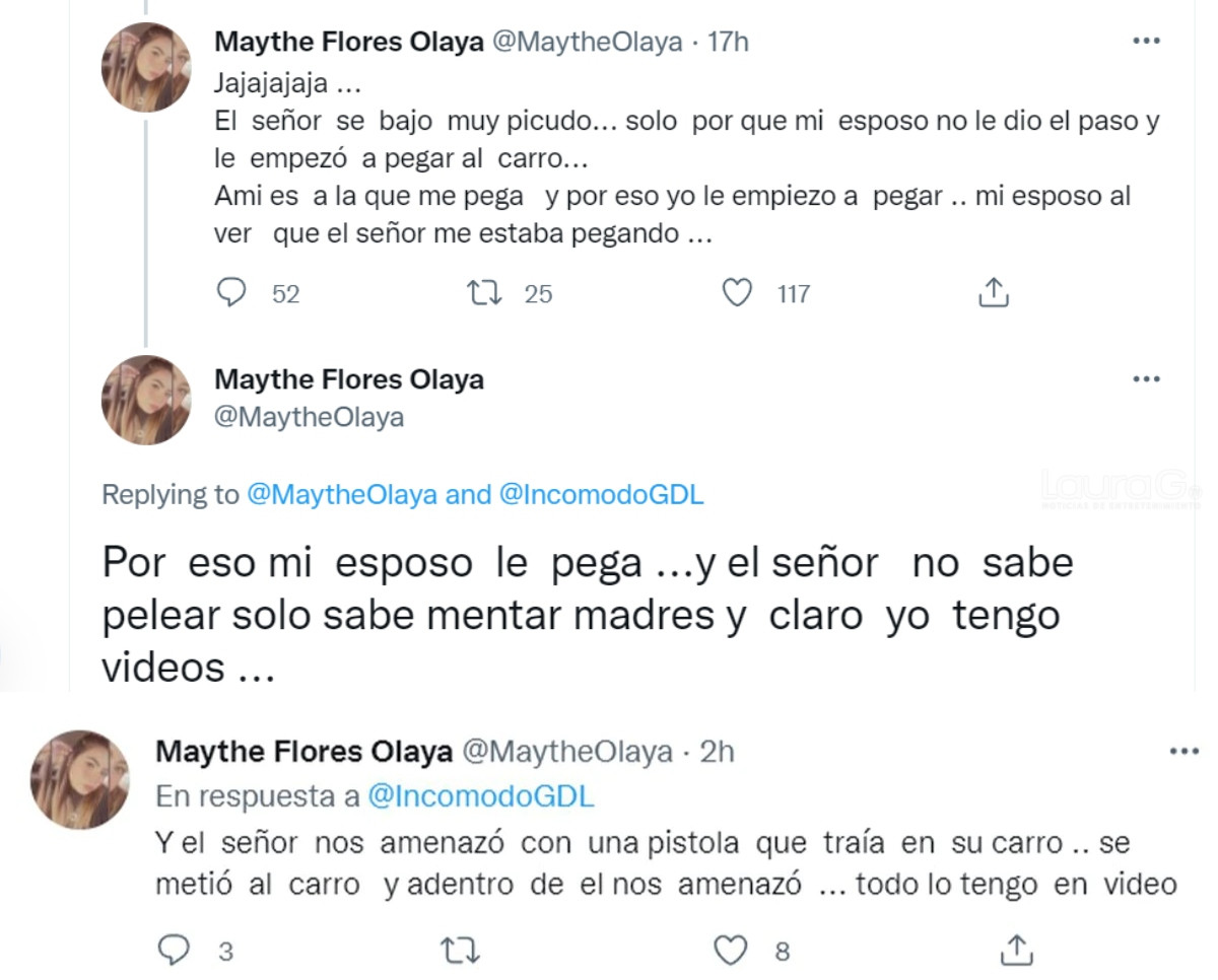 Por su parte la mujer involucrada en el percance, apareció en Twitter bajo el usuario Mayte Flores Olaya reaccionando a vídeos que circularon en la plataforma para asegurar que tenía más vídeos donde la golpea.