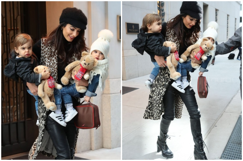 En las imágenes aparece la famosa abogada de 40 años cargando en ambos brazos a Ella y Alexander, quienes van muy bien abrigados. Amal sin perder el estilo luce una boina negra y vestida de negro, con un chaleco largo animal print.