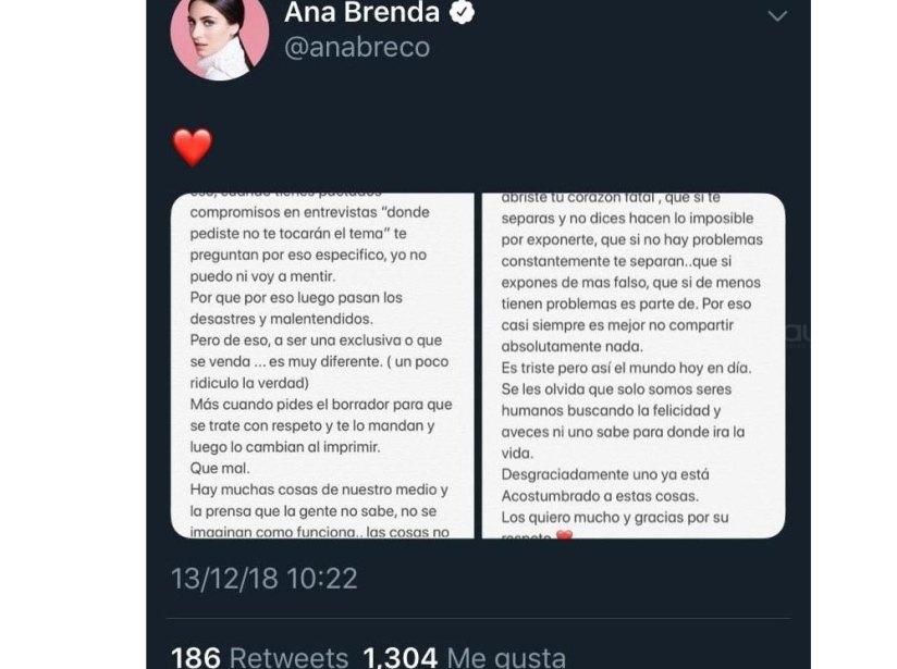 “(…) cuando tienes pactados compromisos en entrevistas donde pediste que no te tocarán el tema, te preguntan por eso específico yo no puedo ni voy a mentir porque por eso luego pasan los desastres y malentendidos. Pero de eso a ser una exclusiva o que se venda es muy diferente. Un poco ridículo la verdad. Más cuando pides el borrador para que se trate con respeto y te lo mandan y luego lo cambian al imprimir. Qué mal.”