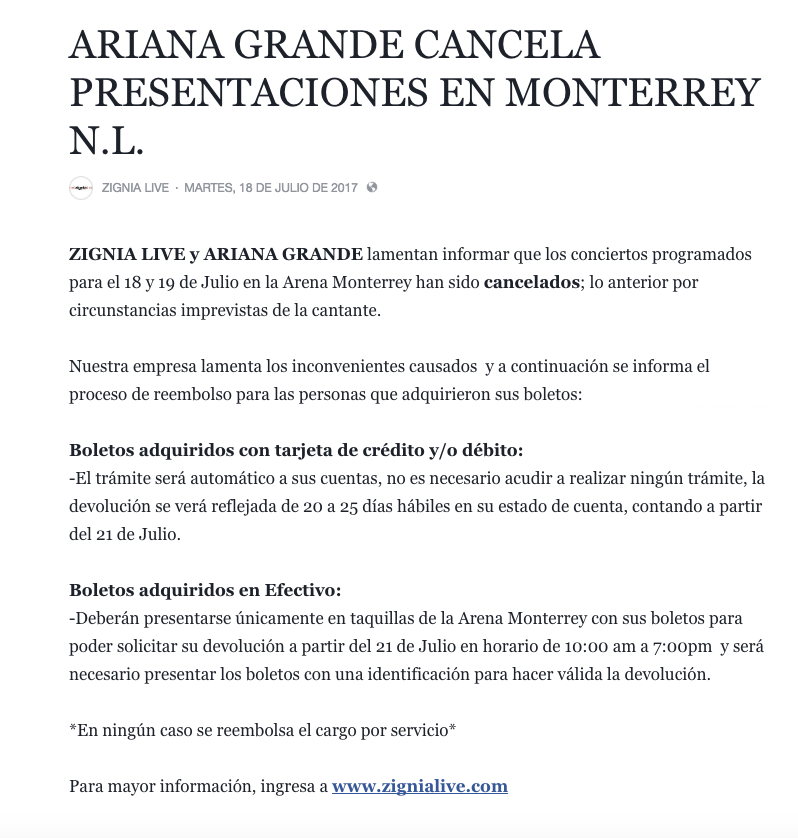 Rumores y cientos de suposiciones sobre los conciertos de Ariana Grande en Monterrey, fueron los que poco a poco dejaban al descubierto que probablemente no se llevarían a cabo los conciertos, pero en la madrugada del martes se dio a conocer que se había cancelado definitivamente.